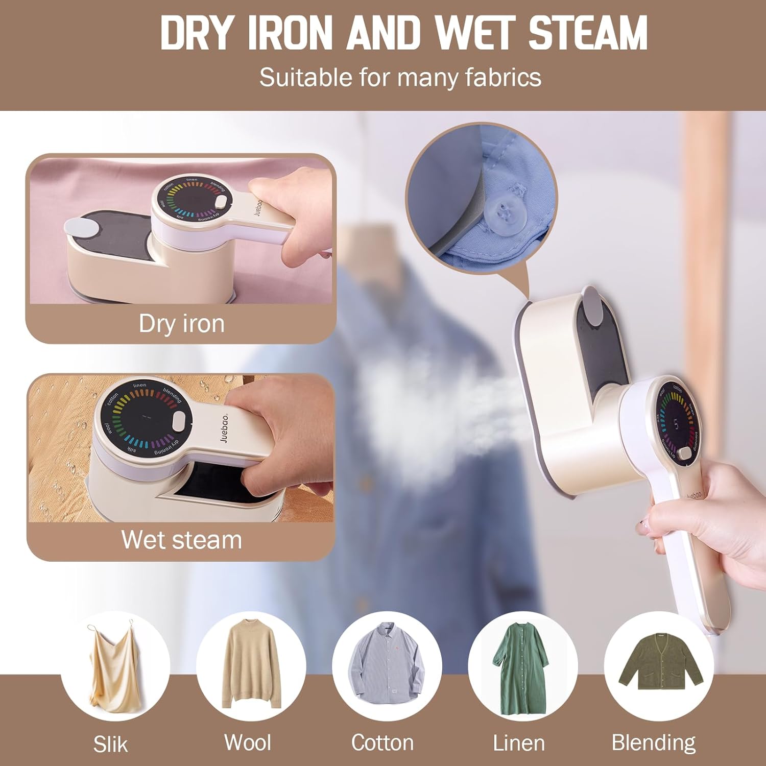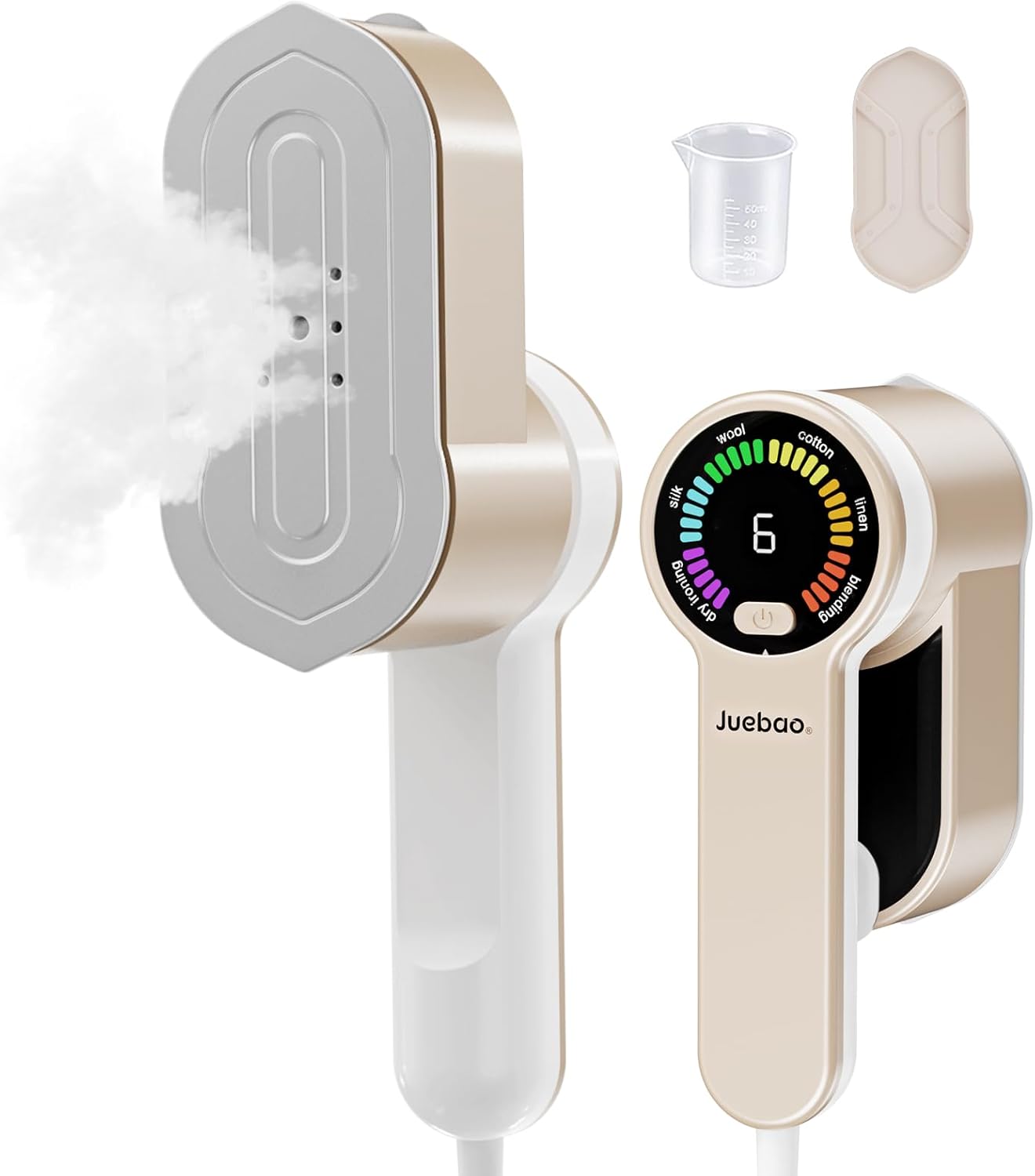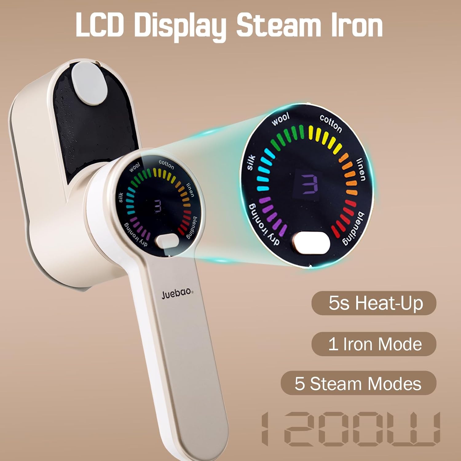 Product description:5 Levels of Steam Output: The upgraded 2-in-1 steam iron features a unique LCD screen, offering both dry ironing mode and 5 levels of steam modes, each corresponding to different fabric types displayed on the screen. This provides flexibility when ironing your clothes, with each steam level intelligently controlled to better protect your garments from temperature damage. The iron also comes with a 180° rotatable handle, allowing you to use it for both horizontal and vertical ironing.